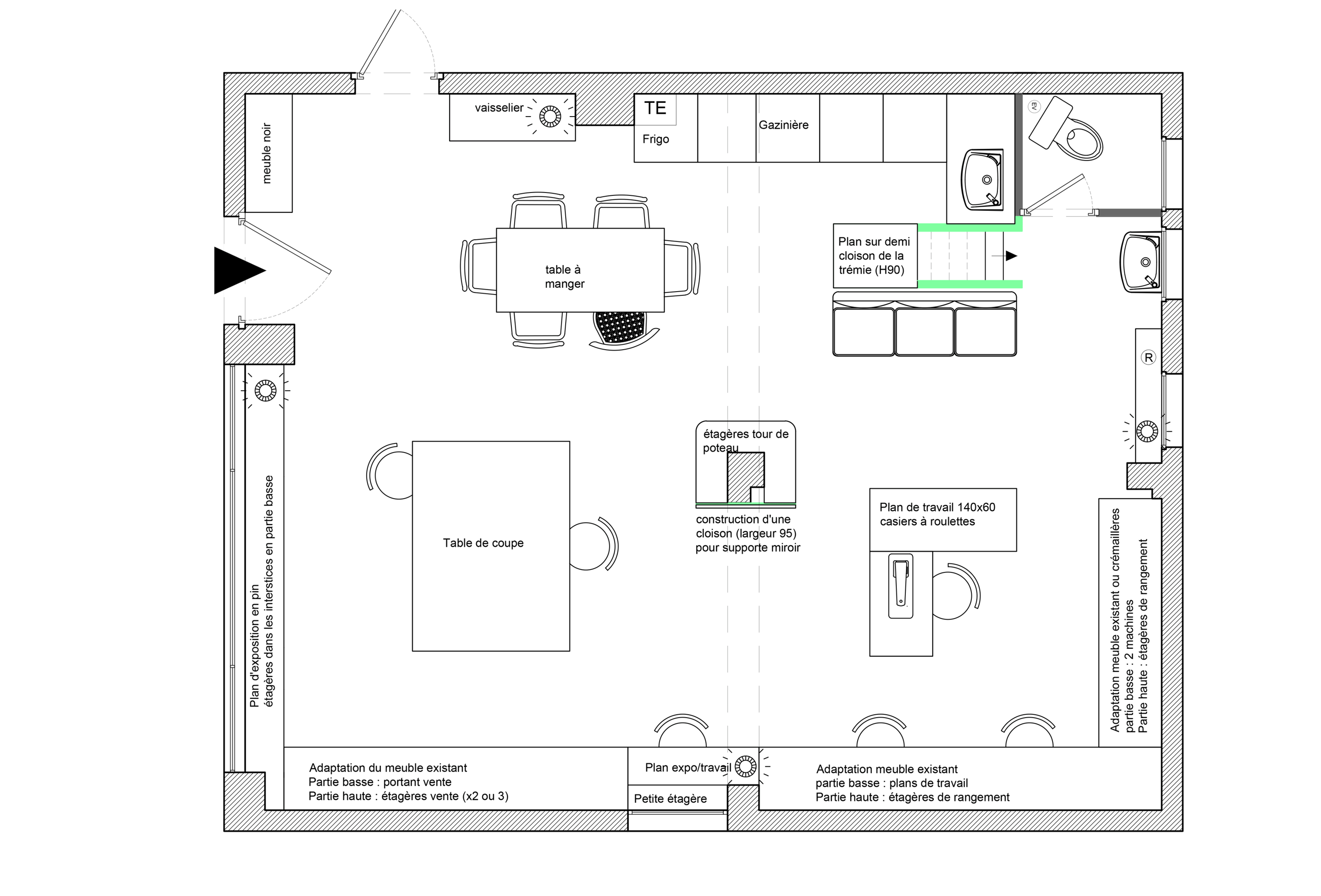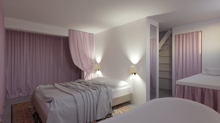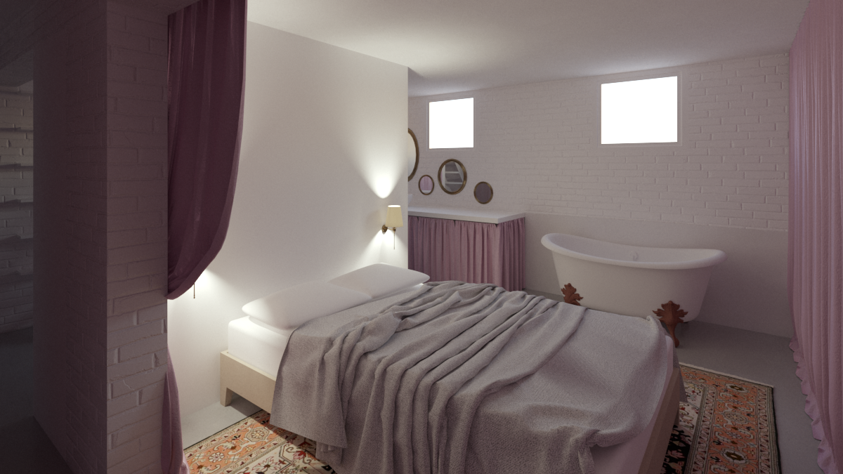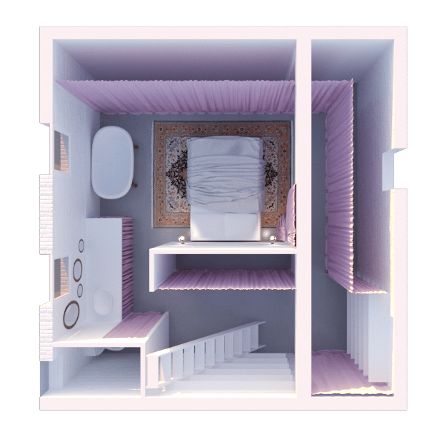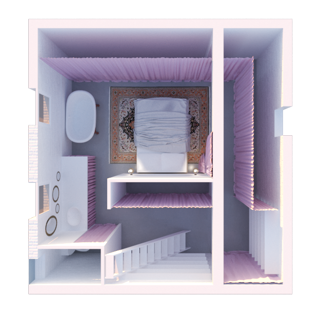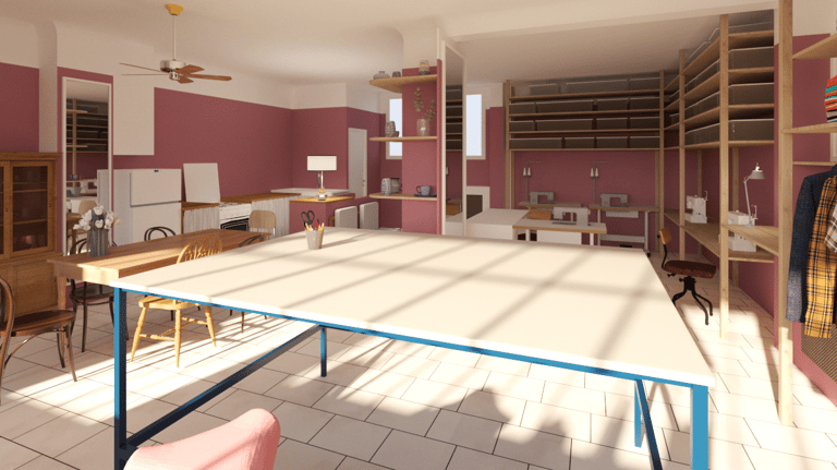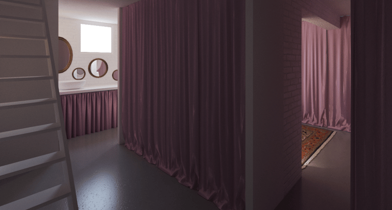 Pour y voir plus clair, elle nous demande d'imaginer un espace placé sous le signe de la récupération, du théâtre et de l'improbable. Nous privilégions une approche fonctionnelle pour le RDC, espace de travail ouvert polyvalent. Le -1 est quant à lui envisagé comme un dédale de rideaux de velours rose. Cette barbe à papa opulente contraste avec les matériaux bruts du sous-sol (brique peinte, béton, parpaing) pour offrir une sensation de confort insoupçonné; une tension dramatique s'installe.