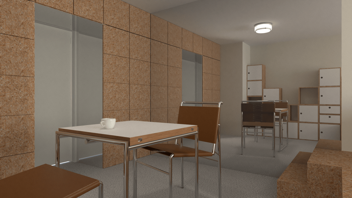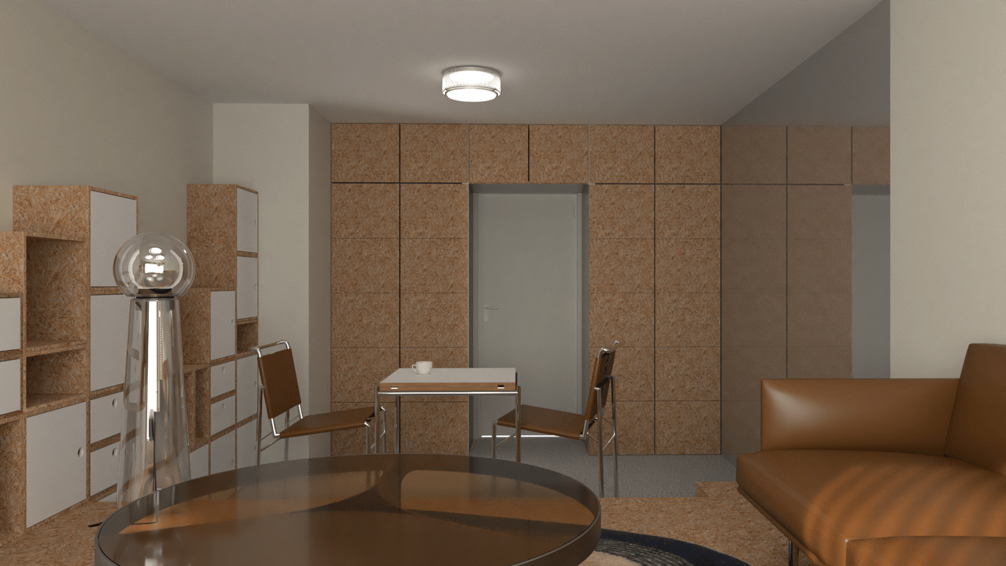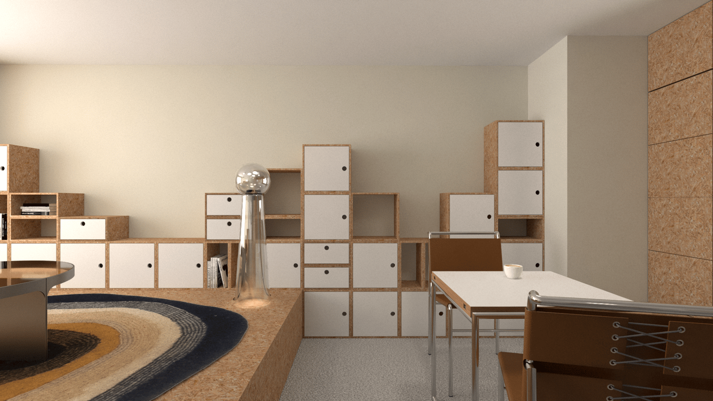 Dans cette interprétation, nous créons deux zones distinctes en construisant un demi-niveau en OSB. Cette surélévation du plancher nous permet d'intégrer un lit double à même la structure afin qu'il soit totalement dissimulé en journée. Les zones créées répondent à différents besoins, un coin repas/travail d'un côté et un coin réception/salon de l'autre.