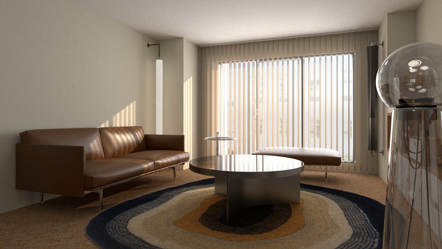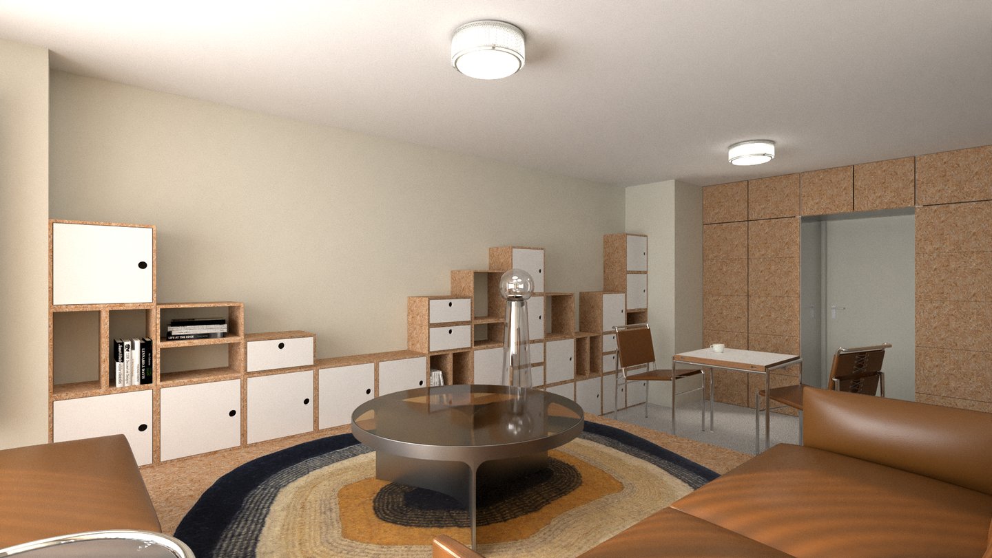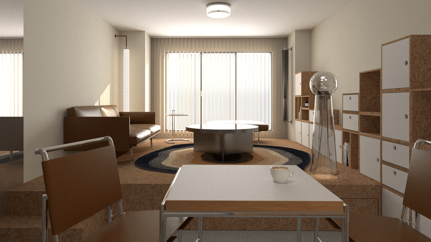 Dans cette interprétation, nous créons deux zones distinctes en construisant un demi-niveau en OSB. Cette surélévation du plancher nous permet d'intégrer un lit double à même la structure afin qu'il soit totalement dissimulé en journée. Les zones créées répondent à différents besoins, un coin repas/travail d'un côté et un coin réception/salon de l'autre.